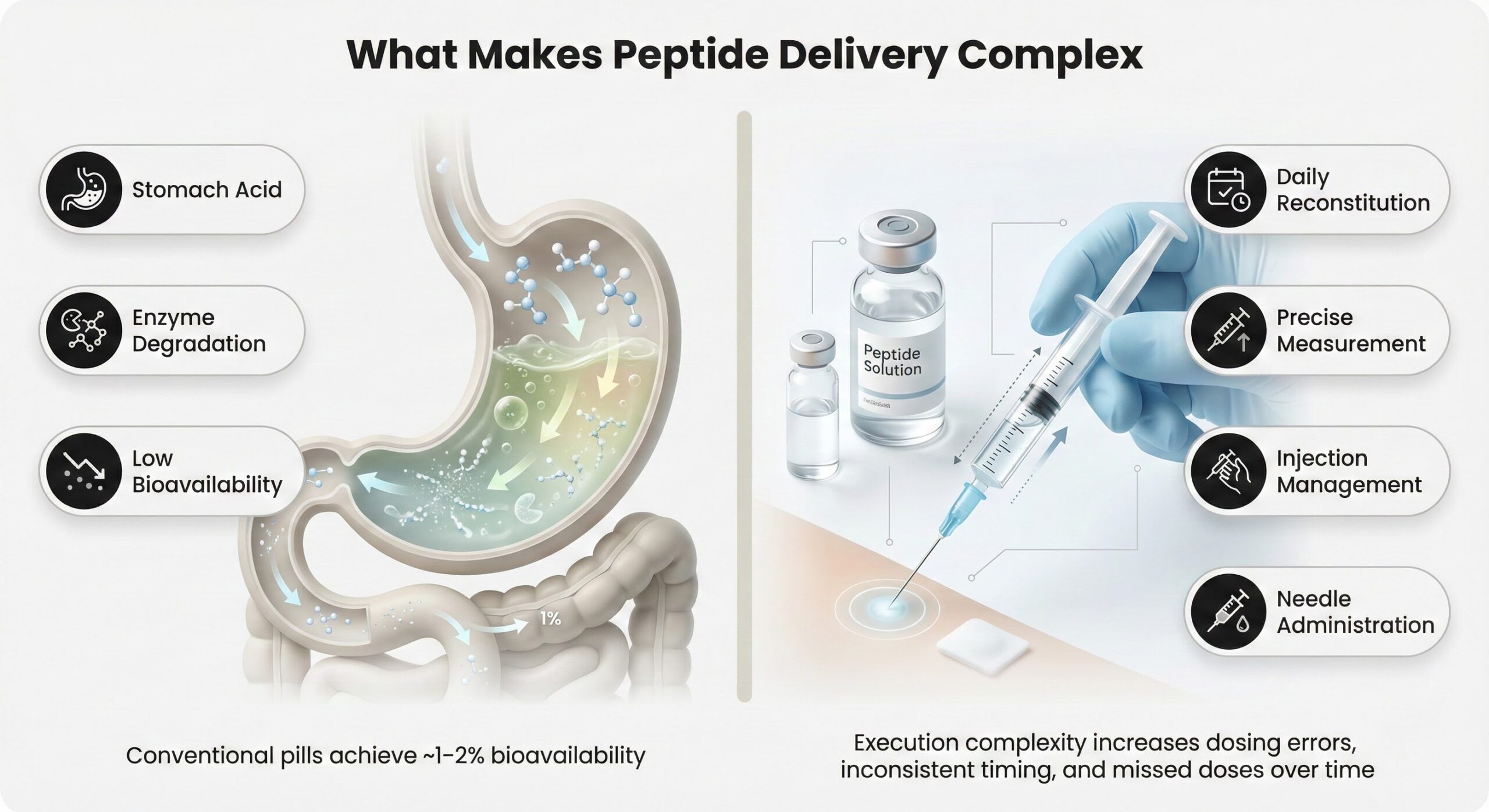 Peptides are fragile molecules that degrade rapidly when exposed to stomach acid and digestive enzymes, which is why conventional pills achieve bioavailability of just 1-2%. Injectable peptides bypass digestion entirely and deliver peptides effectively, but they introduce execution challenges: daily reconstitution, precise measurement, injection-site management, and needle-based administration. These complexities don't just cause discomfort—they create opportunities for dosing errors, inconsistent timing, and missed doses that reduce the reliability of results over time.[1]