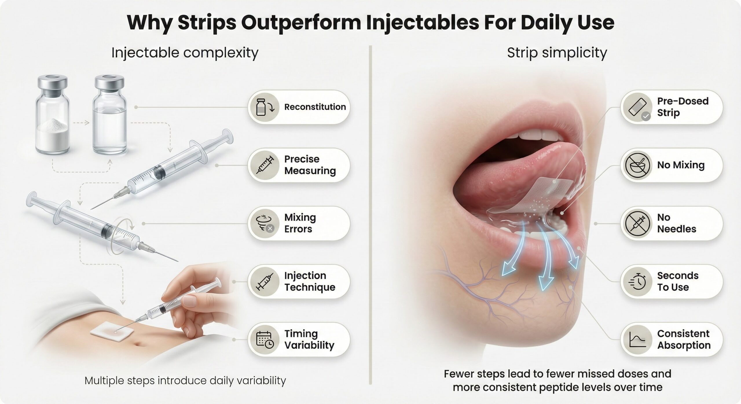 The advantage of strips isn't about absorption potency—it's about execution reliability. Injectable peptides require reconstitution of lyophilized powder with sterile diluent, accurate measurement, proper mixing to avoid gel formation, and correct injection technique. Each step introduces variability. A rushed morning reconstitution, slightly off measurements, or inconsistent injection timing all impact how consistently active peptide reaches effective levels.
