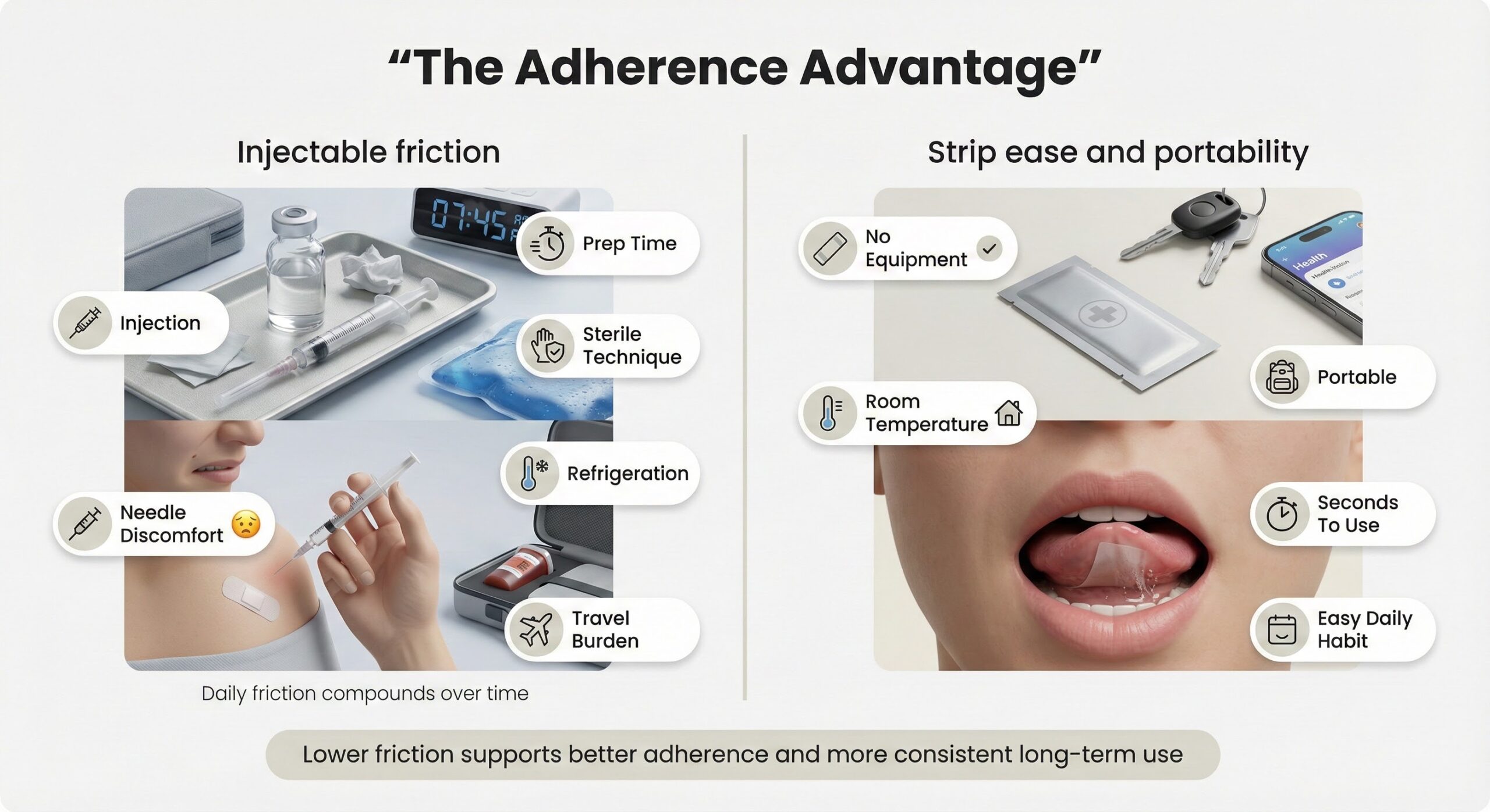 Adherence isn't just about motivation—it's about friction. Complex routines fail not because people don't care, but because daily life creates obstacles. Injectable peptides face adherence challenges that compound over time: the physical discomfort of needles, the time required for preparation, the difficulty of maintaining sterile technique, and the logistics of traveling with refrigerated vials and supplies. Strips remove all of that friction. They're portable, stable at room temperature, require no equipment, and take seconds to use.