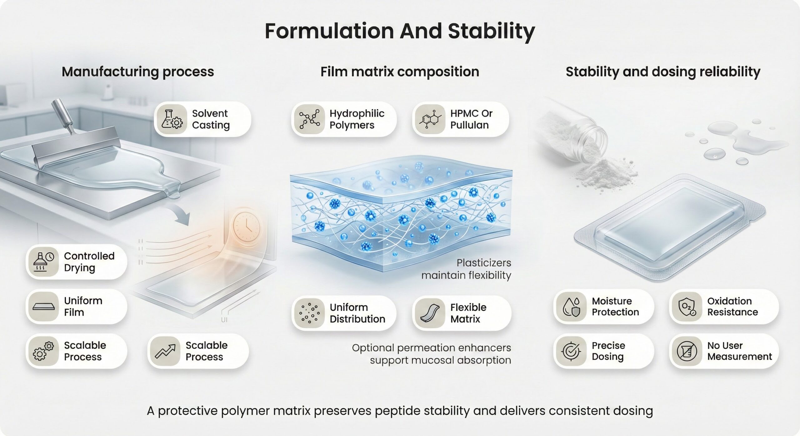 Strips are manufactured using solvent casting, where polymer solutions containing the peptide are cast onto flat surfaces and dried under controlled conditions. The resulting film matrix is composed of water-soluble hydrophilic polymers like hydroxypropyl methylcellulose (HPMC) or pullulan, which provide rapid dissolution while protecting the peptide from oxidation and moisture during storage. Plasticizers maintain flexibility, while permeation enhancers can be incorporated to improve mucosal absorption.