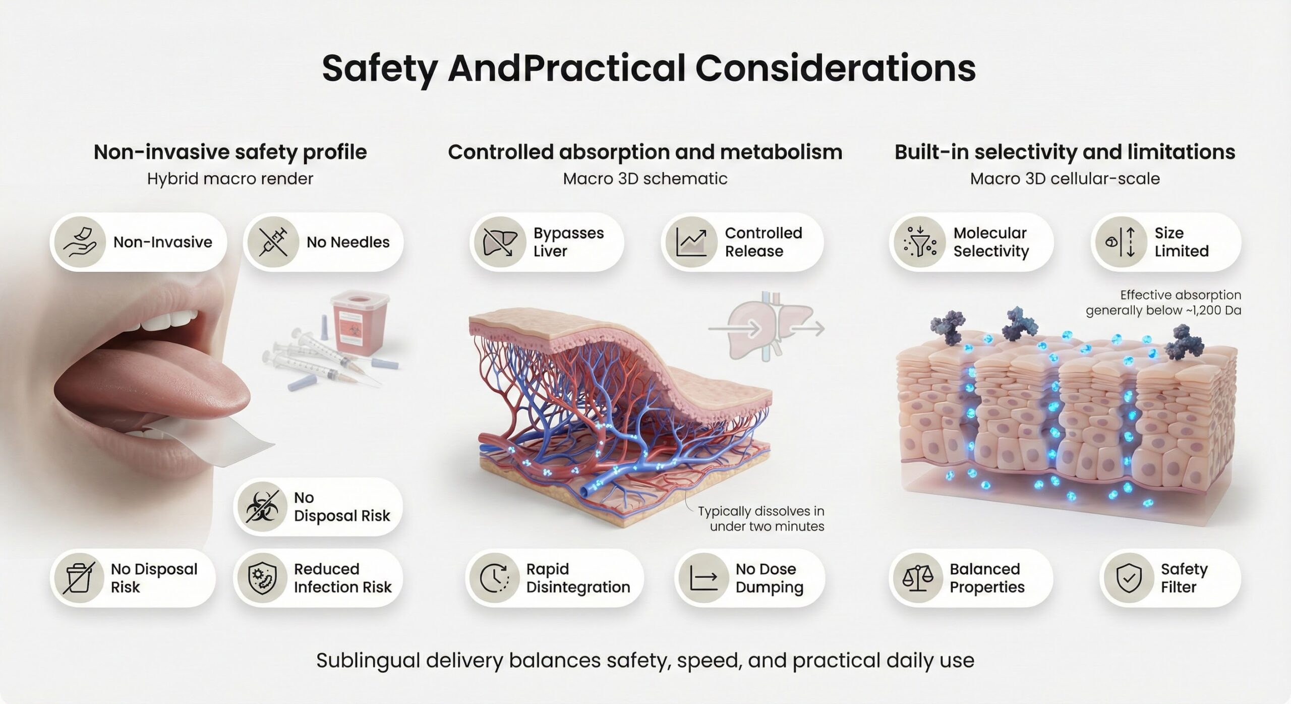 Absorption through the oral mucosa is limited by molecular size and physicochemical properties—peptides must generally fall below 1,200 Da and possess balanced hydrophilic/lipophilic characteristics to cross mucosal barriers effectively. This selectivity serves as a built-in safety mechanism, as only appropriately sized molecules achieve significant absorption.