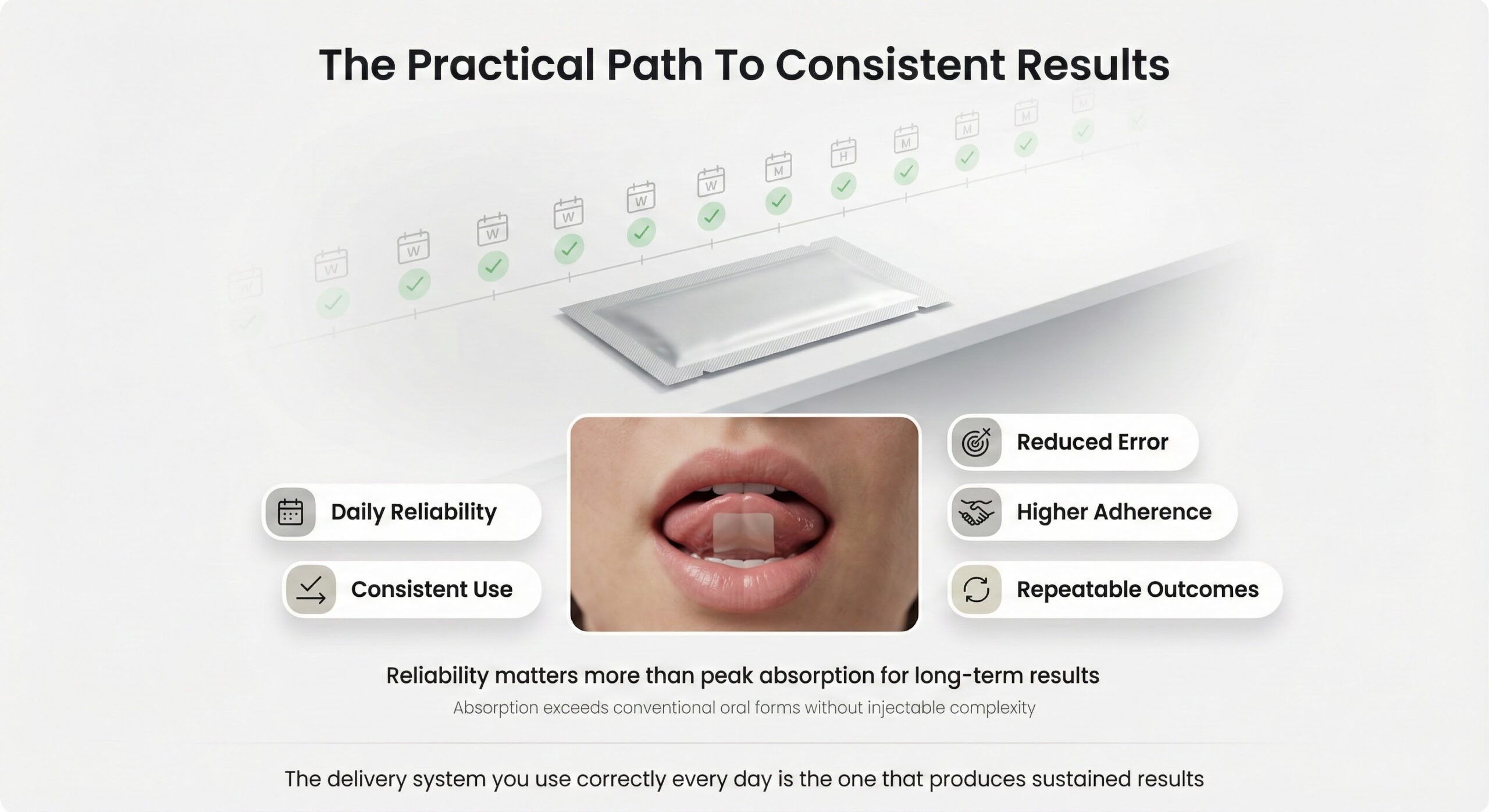 Peptides deliver benefits when used consistently at effective levels. Dissolving strips achieve this not by maximizing absolute bioavailability, but by maximizing reliability. They eliminate the technical complexity, measurement error, and psychological resistance that undermine injectable adherence, while providing absorption rates that far exceed conventional oral formulations. For daily peptide use over months or years, strips represent the delivery system most likely to produce sustained results—because they're the system you'll actually use correctly, every single day.