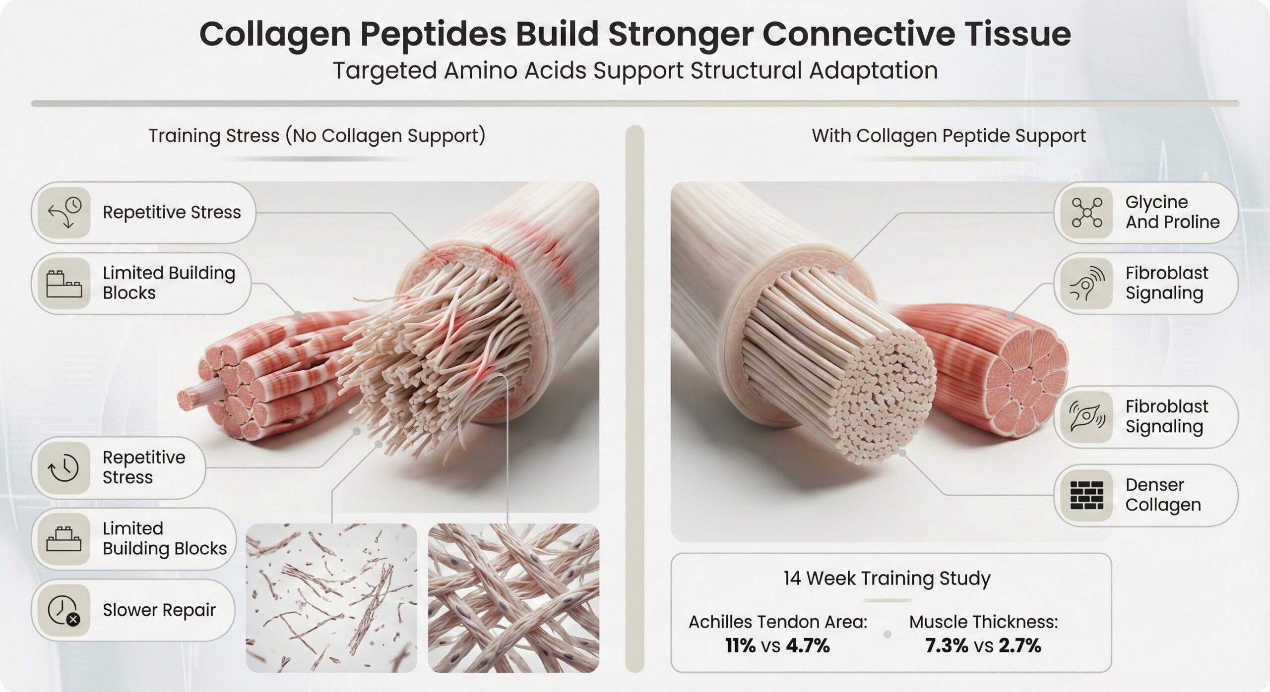 Collagen peptides are short chains of amino acids that provide glycine, proline, and hydroxyproline—the exact building blocks needed for new collagen fibers. Specific peptide sequences also signal fibroblasts to ramp up collagen production, making them particularly effective for strengthening tissues under repetitive stress.