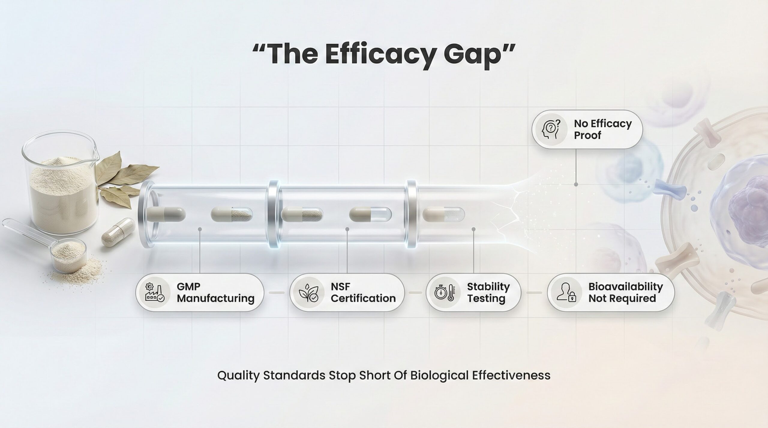 GMP certification addresses manufacturing consistency but says nothing about whether a supplement actually works. NSF certification explicitly does not test for efficacy—it verifies that products contain what the label claims and are produced safely, but makes no assessment of biological effectiveness. This represents a fundamental limitation: a product can be manufactured perfectly to specification while delivering no meaningful health benefit. Stability testing evaluates how environmental factors affect quality over time and helps determine shelf life, but bioavailability testing—which would assess how well active ingredients are absorbed and utilized—is not mandated under 21 CFR Part 111.
