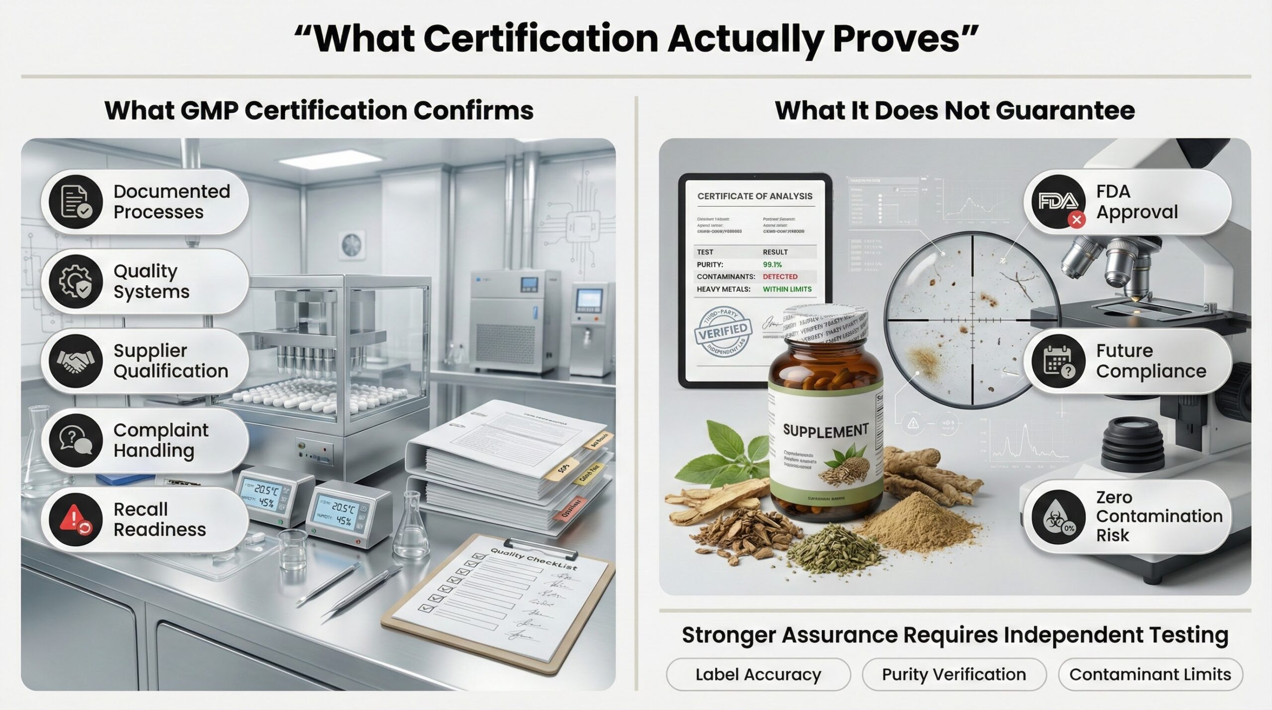 GMP certification verifies that quality systems exist and function at the moment of audit—it demonstrates repeatable processes, documented controls, supplier qualification, complaint handling, and recall procedures. However, certification does not constitute FDA approval, does not guarantee future compliance without ongoing surveillance, and does not eliminate contamination risk, particularly for botanical ingredients prone to environmental contamination. For meaningful quality assurance, GMP certification should be combined with third-party product testing that independently verifies finished products for label accuracy, purity, and contaminant limits.