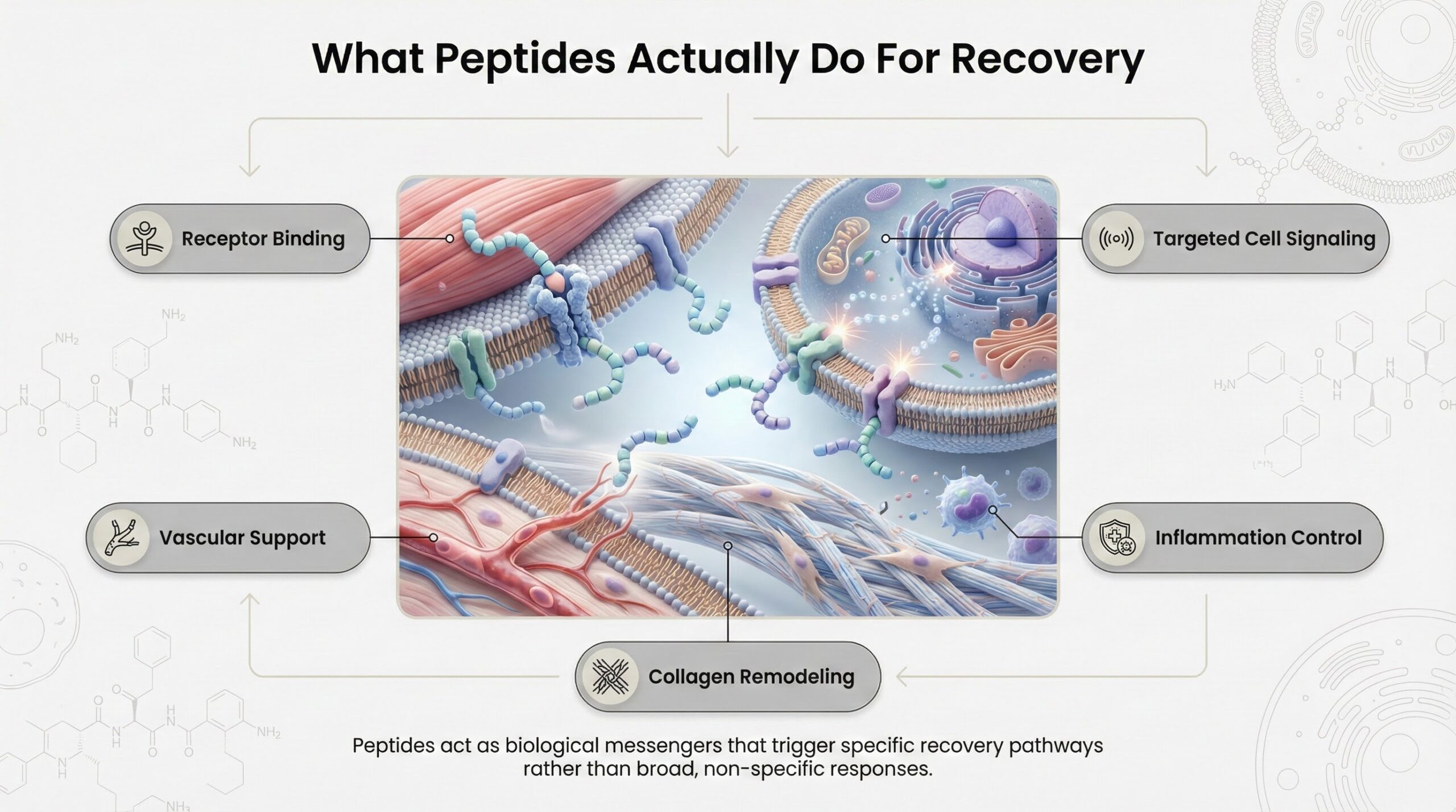 Peptides are short chains of amino acids that function as biological messengers. When introduced into the body, they bind to receptors on cells and trigger specific responses—such as increased blood vessel formation, enhanced cell migration to injury sites, or stimulated production of growth factors. This targeted signaling is what separates peptides from broad-spectrum anti-inflammatories or passive recovery methods.
