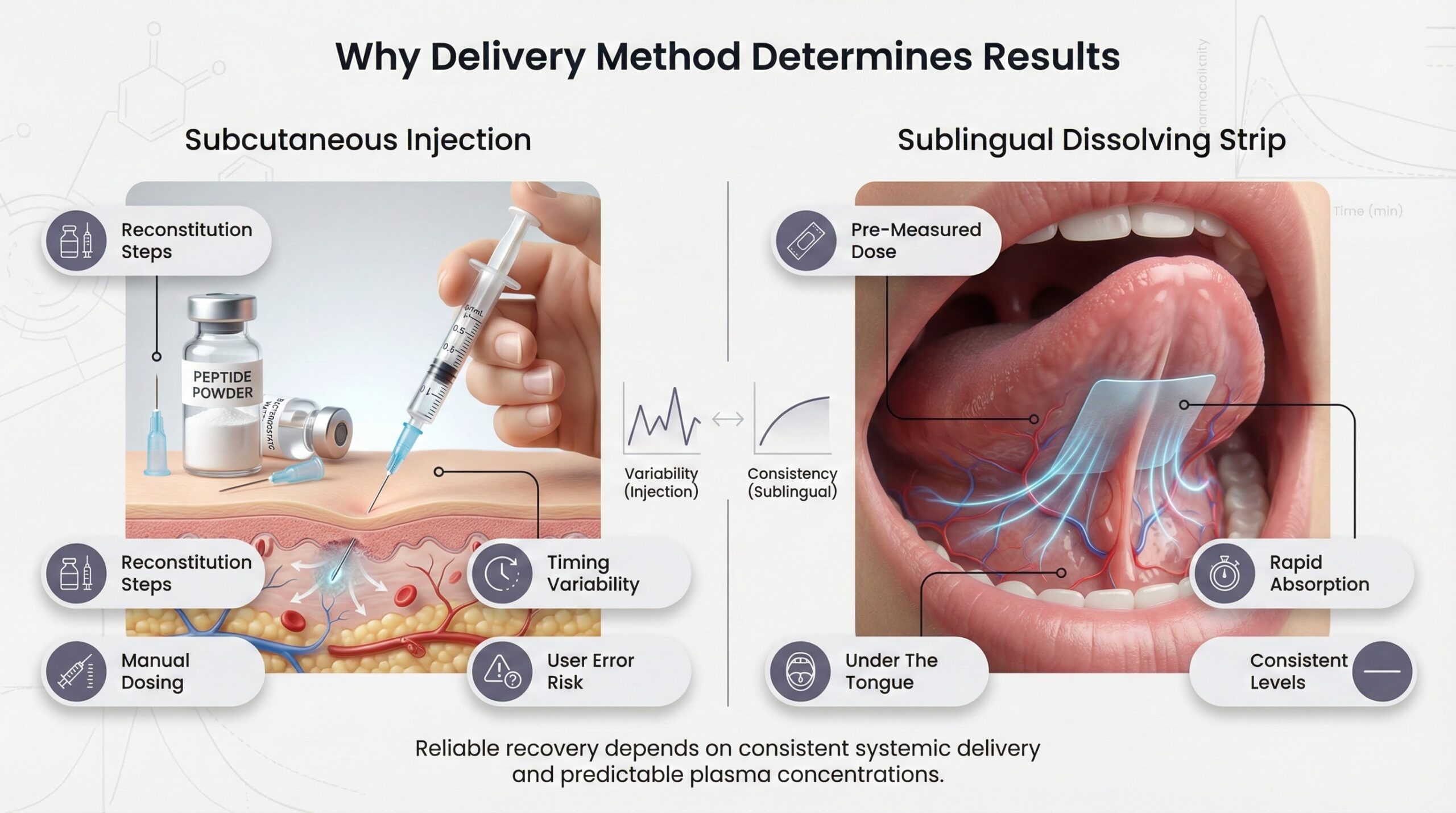 The critical advantage is consistency. Strips deliver a pre-measured dose with no reconstitution, no needles, and no injection-site management. This reduces user error to nearly zero and ensures that each dose produces the same pharmacokinetic profile. For athletes who need daily or frequent dosing over extended periods, this reliability is what separates theoretical benefit from actual recovery.