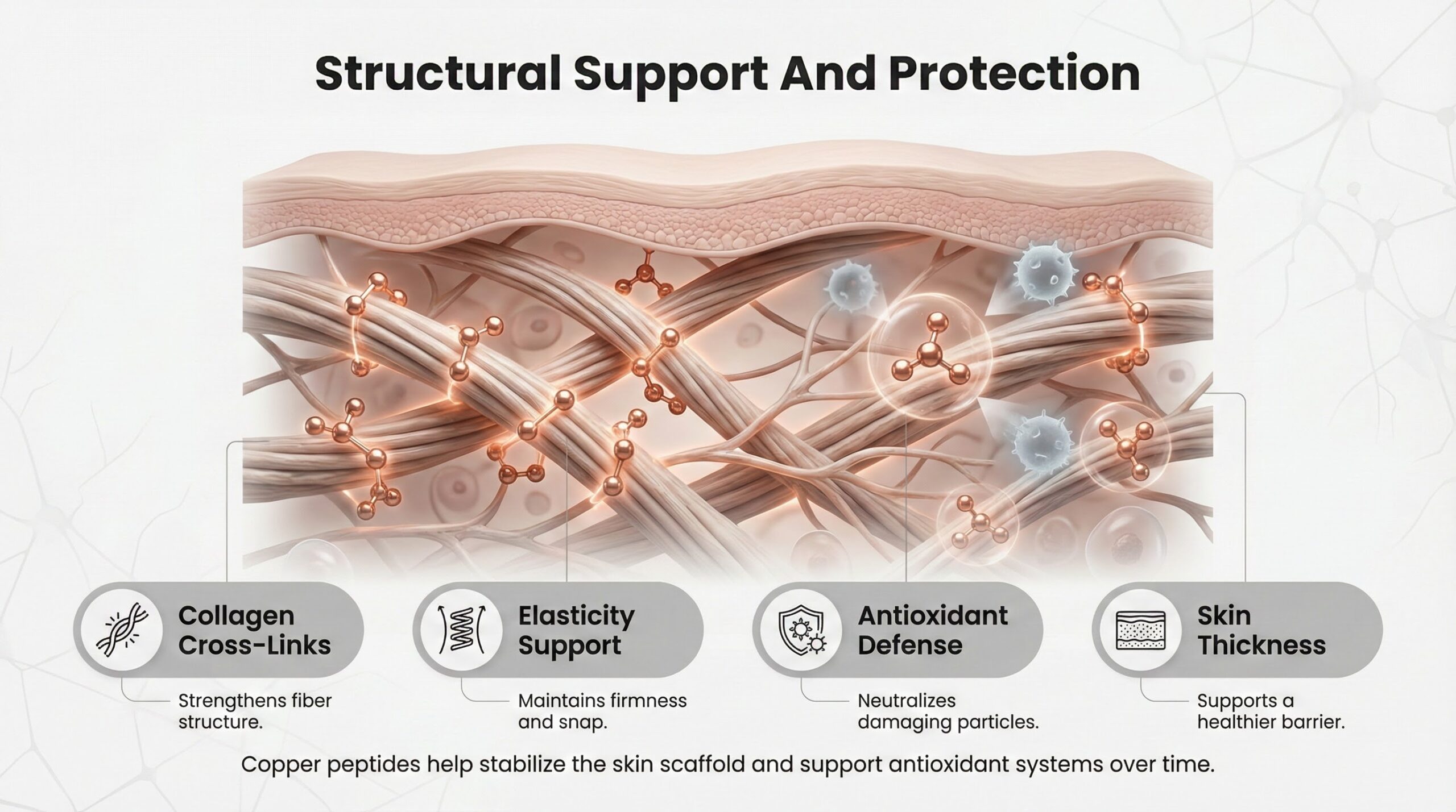 Copper-dependent enzymes help create durable cross-links between collagen and elastin fibers, which determine whether new tissue holds up under daily mechanical stress or breaks down prematurely. By stabilizing this scaffold, copper peptides contribute to skin that resists sagging and fine-line formation over time.