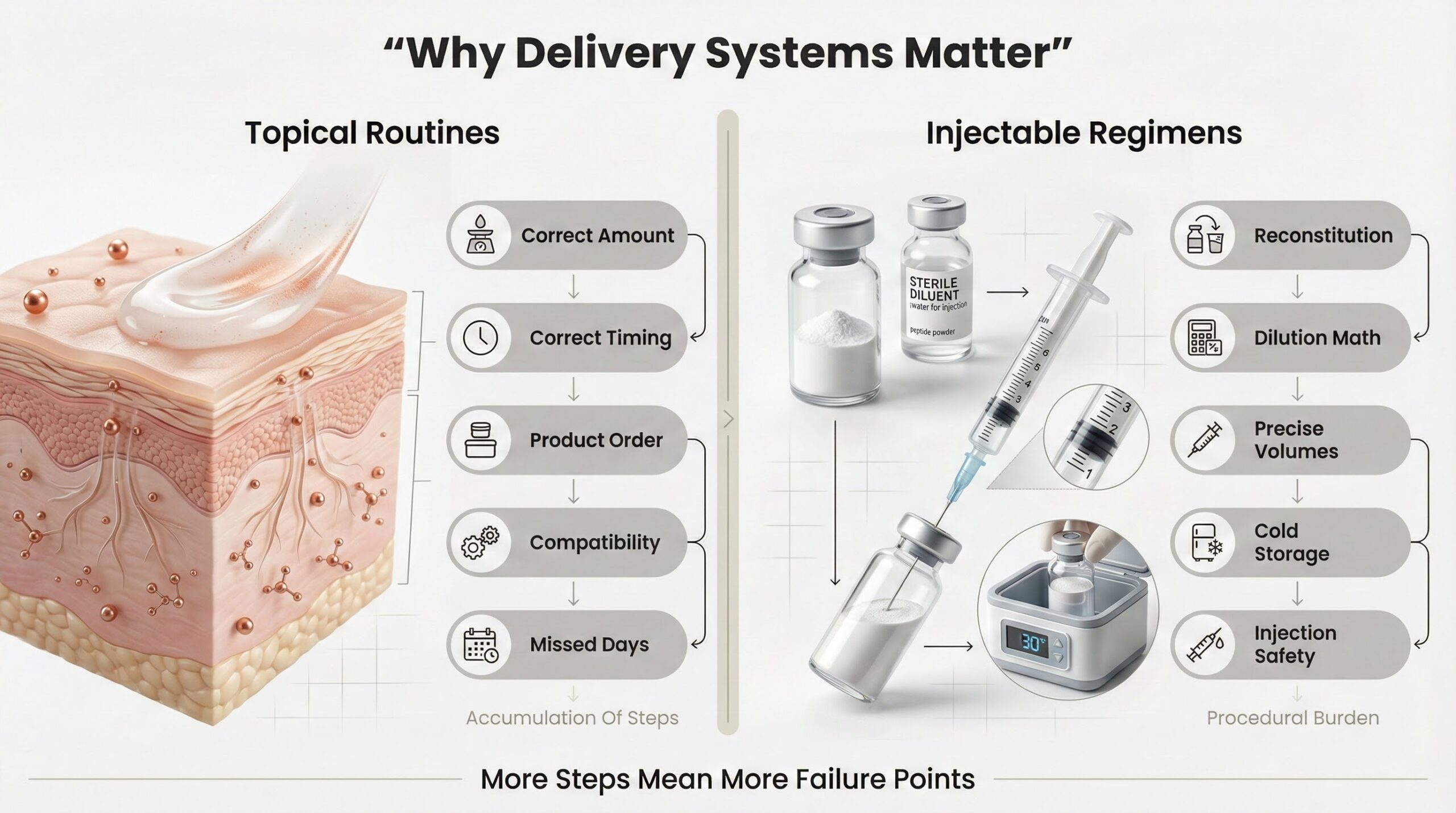 - Injectable regimens add even more system steps: reconstituting peptide powder, calculating dilution, drawing precise volumes, storing correctly, and performing injections safely, all of which must be repeated accurately over long periods.