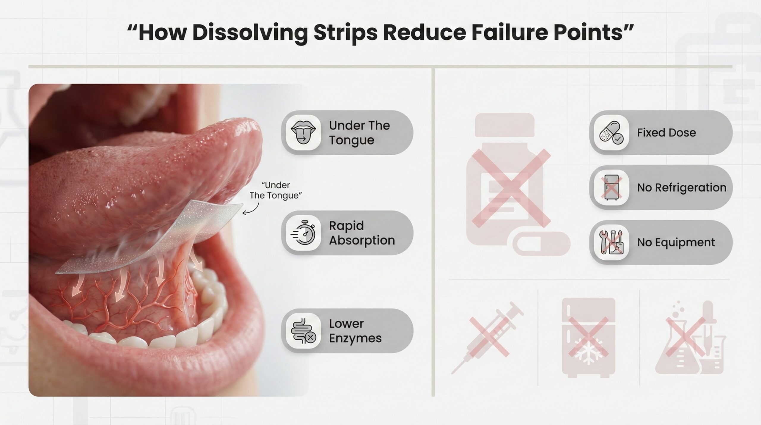 - Strips require no refrigeration, no sterile technique, and no equipment, eliminating common friction points that cause people to skip doses or abandon more complex delivery systems.