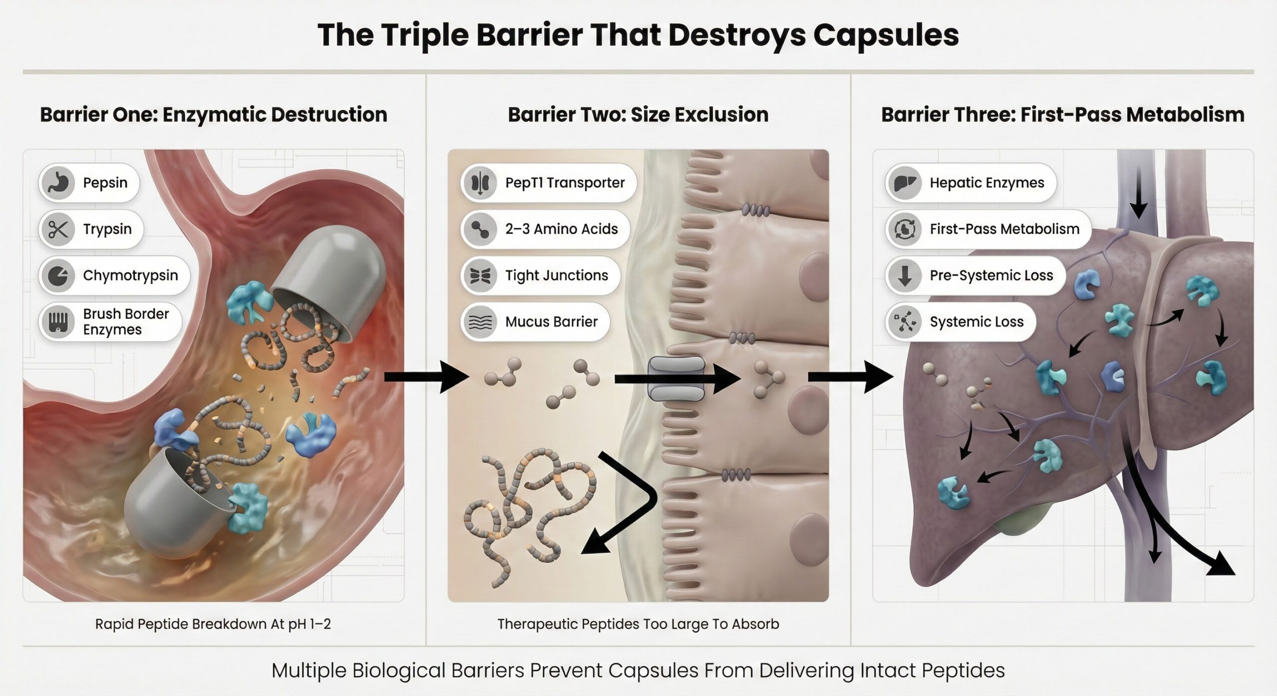 Peptides in capsule form must survive three sequential destruction zones before entering circulation.[2]