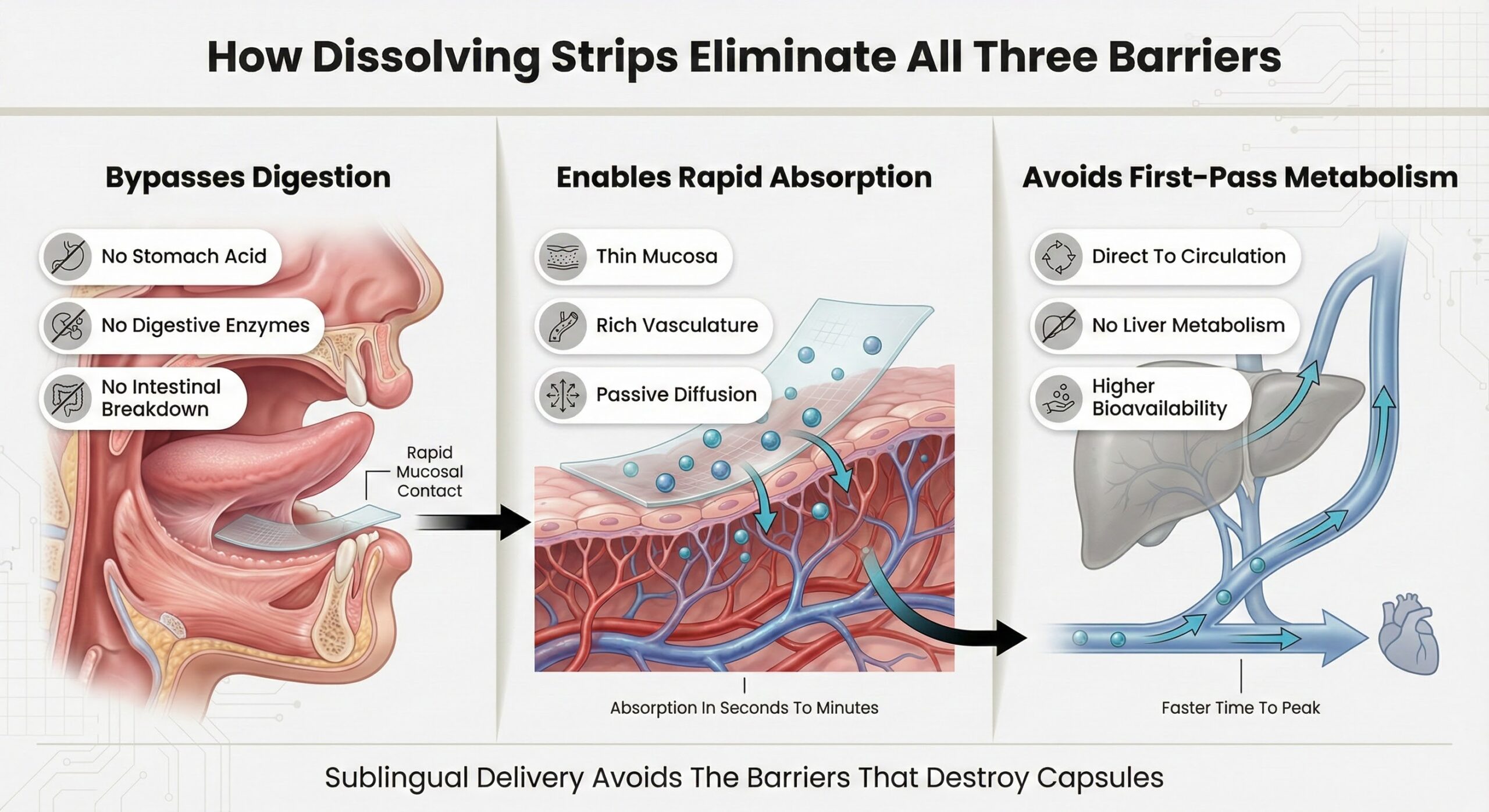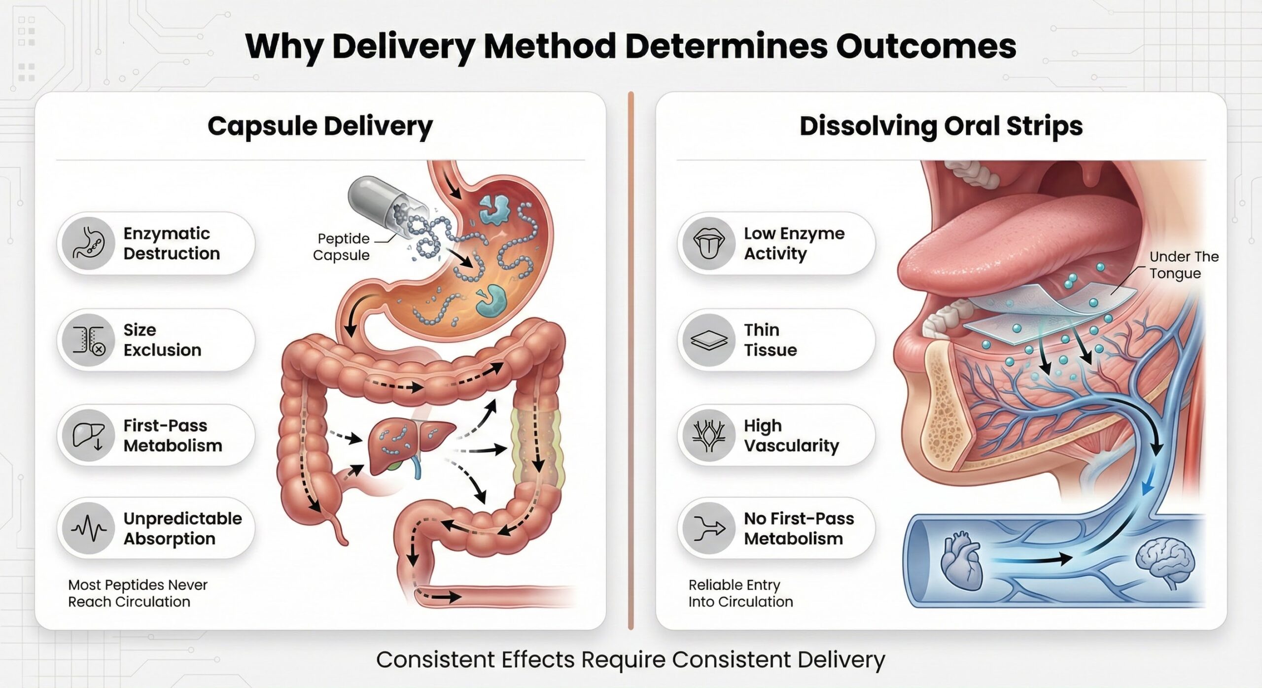 For peptides to work consistently, they must reach circulation consistently. Dissolving strips make that possible through a delivery system designed around how the body actually processes peptides—not by hoping capsules can overcome barriers they were never designed to bypass.[1]
