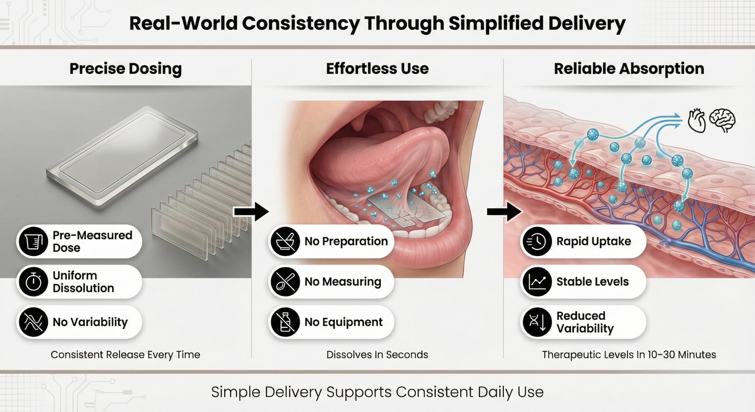 Strips require no preparation, no measurement, and no equipment—you place them on your tongue and they dissolve. This simplicity translates to consistent use over weeks and months, which determines whether therapeutic benefits are realized. Sublingual delivery achieves therapeutic plasma concentrations within 10–30 minutes with stable peak levels and reduced variability.[1]